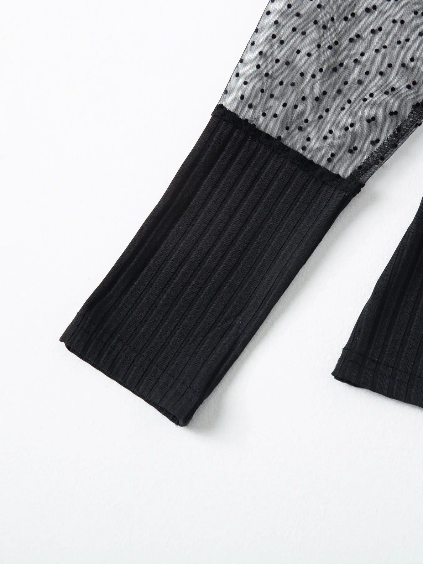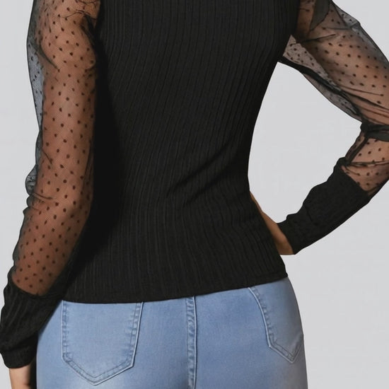 Questo top unisce design moderno e dettagli ricercati: le maniche a sbuffo in tulle trasparente con pois, il taglio aderente e la scollatura squadrata creano un look sofisticato e audace. È il capo perfetto per chi vuole distinguersi con stile e personalità.